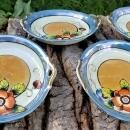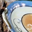 Art Deco butter pat/chip set in orange, cream and blue luster, with bold floral detail, black line, and gold trim. Round shape, with 2 cut-out handles on each. 3.75"d. No mark, but likely to be Noritake, circa 1920's-30's. Set of 4. Very good condition with no chips or cracks, just light wear to gold trim. Sold as is, and as a set of 4. Inglenook Antiques...Established 1989.