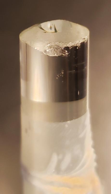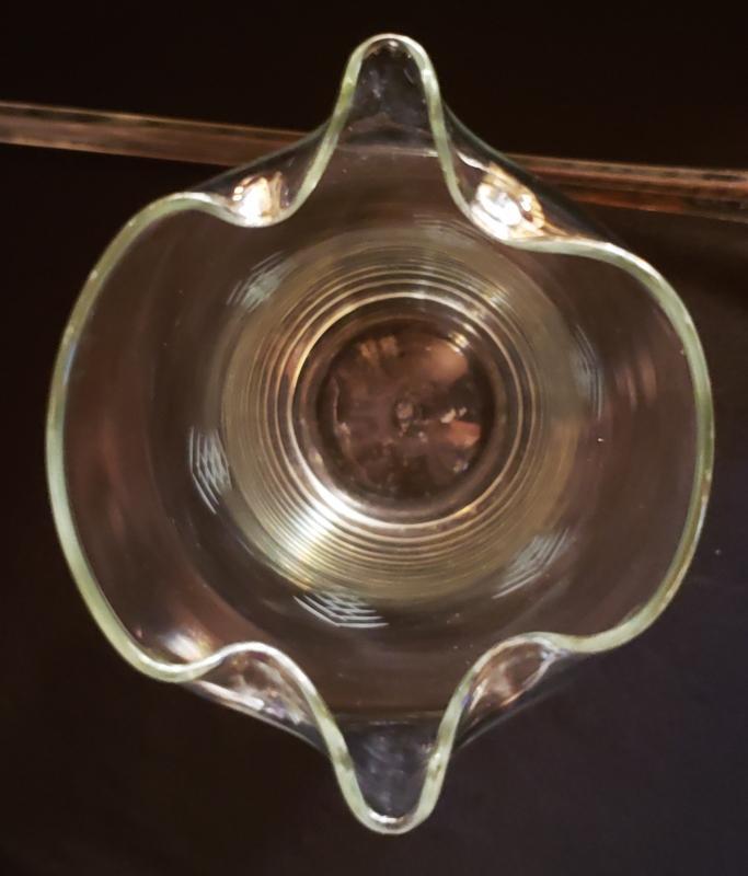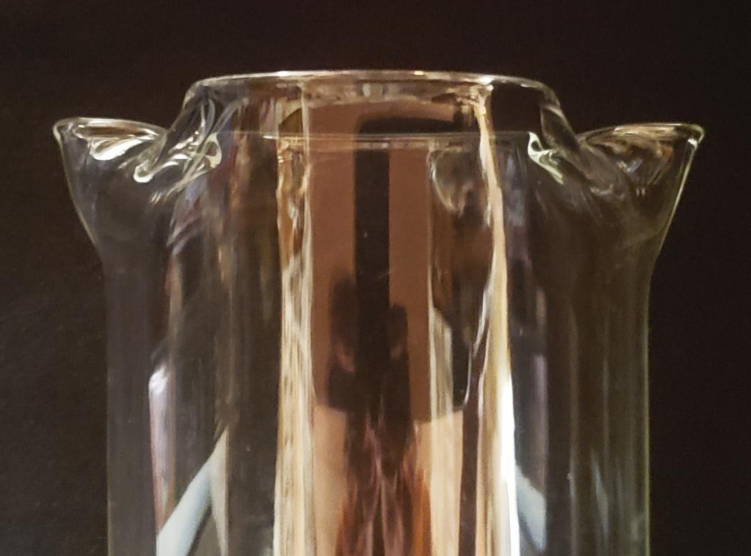 "Picket" pattern blown crystal cocktail/martini pitcher with glass stir rod, made by Javit. Clear with cut cross-hatching. Pinched spouts on opposite sides. Pitcher measures 9.25"h x 2.75"d; stir rod measures 10.5"l. Nice condition with no chips or cracks to the pitcher; only a small chip to the flat end of the rod. Sold as is. Inglenook Antiques...Established 1989.