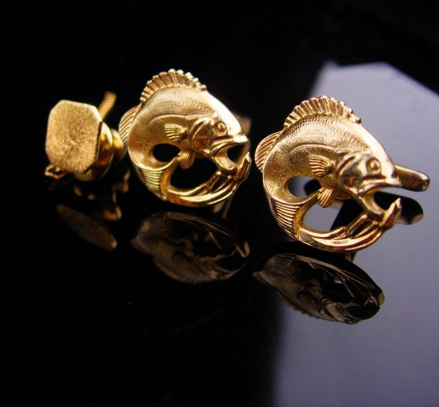 Vintage Fish Cufflinks / golden bass set / Bonus Tie Tack / Trout Fisherman / Fathers Day / mens Birthday / Hickok USA
