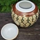 Kutani Japan ginger jar with hand-painted decoration of white daisies and gold trim, with red seal mark on bottom. Dates from the 1960s. Measures 5.25"h x 4.5"d. Burgundy bands with gold scroll and geometric designs. Nice condition with no chips or cracks, just a few scratches to the lid as shown. Inglenook Antiques...Established 1989.