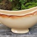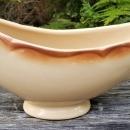 Restaurant ware ceramic footed sauce/gravy boat made by Homer Laughlin, marked "Best China". Date code for 1964. Measures 3 3/4"h at handle x 9"l. Airbrushed with brown & tan glazes on a western-style body with scallops below the rim. Excellent condition with no chips or cracks. Inglenook Antiques...Established 1989.