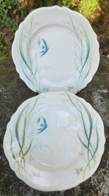 Mayer China "MYR76" pattern restaurant ware plates, dating from 1961 and 1965. Green and blue scene of tropical fish and seaweed. Each plate measures 5.375"d with a scalloped rim. In good used condition, with only some surface wear from utensils; no chips or cracks. Sold as is, and as a set of 4. Inglenook Antiques...Established 1989.