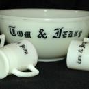 Vintage Tom & Jerry set from the McKee Glass Company. Bowl with 4 mugs These are the Custard Yellow Ivory colored glass mugs with the black lettering. The punch/egg nog bowl measures 5" X 11-1/2" and each mug/cup measures 3-1/2" tall and 2-3/4" wide at the top. Excellent condition on all. Each have circle McK mark on the bottom.. It is uranium glass.