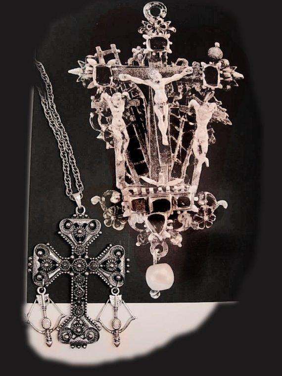 As with most jewelry from the renaissance or even the gothic period, it was BIG and ornate and it had to stand out above those fabulous dresses and coats. As you can see as it lays next to the antique ornate cross from times gone by, it brings the detailing of that period to life now. This huge ( 3 1/2") heavy metal cross has two of the knight's bow and arrows with genuine opals on each side. As you can see on our model it hangs low to accent the positive and is large enough to bring attention to you and how fabulous you look. The thick chain is 24" long and the width of this massive cross is 2 3/4". IN estruscan style and with rich dark patina this is quite an outstanding Cross!Made with vintage pieces that fit so well together, this is one of a kind and quite a conversation piece! VintageSparkles offers Layaway on all our Etsy pieces regardless of which site it comes from. Please remember that vintage & antique items are not mint, nor are they perfect but they sure are full of old history and charm. Please use photos to make your decisions and read our policies prior to buying so you can have an excellent experience with us. Please use this number when ordering ga34321 If you want to see more of these pretties this is the link to my etsy store. http://www.vintagesparkles.etsy.com/