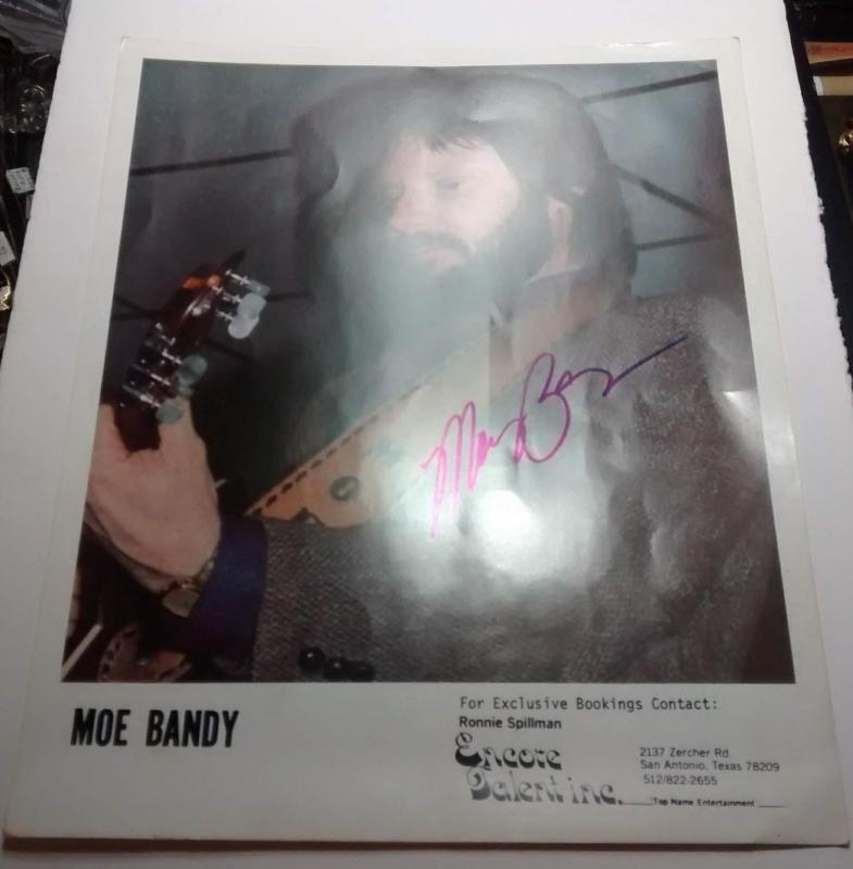 Moe Bandy country music artist signed color photo. Marked "Encore Talent/ Ronnie Spillman/ San Antonio/ Texas". Dates from the 1980s. Good condition with no tears, only a few bends. Sold as is. Inglenook Antiques...Established 1989.