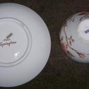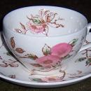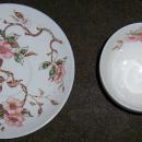 Nasco China, Made in Japan, Springtime Cup and Saucer. Saucer is 6" across, Cup is 2 1/2" high and 3 1/2" across. Handpainted pink flowers, green leaves and brown stems. Very good condition, glaze does have some crazing.