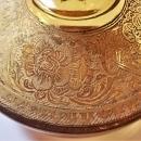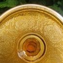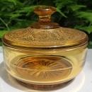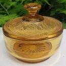Paden City Glass powder/puff box with lid. Gold-encrusted border on amber glass with beautifully etched pattern, dates from the 1920s-30s. #503-5. Measures 4 1/8"d x 3 1/2"h. No chips or cracks, some wear to gold. Sold as is. Inglenook Antiques...Established 1989.