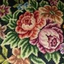 Petit point purse with chain, circa 1930s. Black background with multi-color roses and other flowers, goldtone frame and clasp. Black satin lining. No maker's mark or label. Measures 7.5" x 5.5" rectangular. Very good condition with very little wear. Inglenook Antiques....Established 1989.