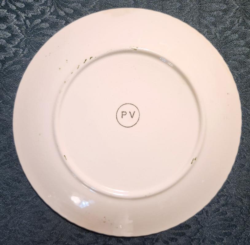 Blue Ridge salad plate with yellow grapes, made by Southern Potteries Inc. of Tennessee, with the "PV" jobber back stamp. Made in the 1940s, with green candlewick edge. Measures 8.5"d. Some crazing, but no chips or cracks. Inglenook Antiques...Established 1989.