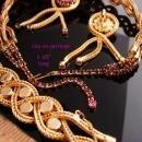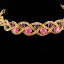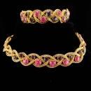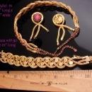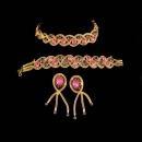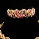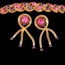 This set was purchased in its original box with no paper tag. There is a fabulous bracelet, matching necklace with purple rhinestone extender and long tassel or fringe earrings. I don't think is was ever worn much if at all. THe box is in poor shape but I wanted to include it so you would have some history with the set. There are no signatures on the pieces so most likely it had paper tags. The colors are pink and purple. It is a really well made set. Sizes are in the photos so you can see how big each piece is.