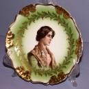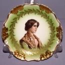This is a beautiful portrait plate and is 6 inches in diameter with a lovely green and gold border. The plate features a Victorian young lady with dark hair and a brow shaw. On the back of the plate it is marked Pensee Bavaria. This plate is part of a group of 11 other with different portraits. If you buy 8 or more plates you will receive a 10% discount.