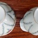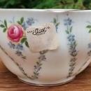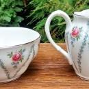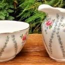 "Minuet" bone china mini cream & sugar with pink rose & blue flower garland decoration on white ground. Made by Royal Albert, England, circa 1950's. One piece has original label from H.A. & E. Smith, Bermuda. Creamer measures 3 1/8"h, sugar 2"h. Gold trim. No damage, apparently unused condition. Inglenook Antiques...Established 1989.