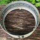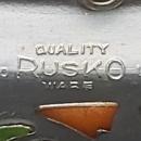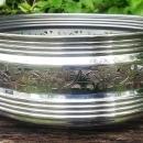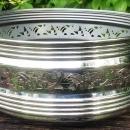 Rusko Ware rose pattern casserole holder, worked in chrome filigree from the 1930s. Maker's mark on inside, marked "Chicago, USA". Measures 7.5" round opening x 3"h. Two butterscotch Catalin/Bakelite handles at sides. Very good condition with only light use wear; no major issues. Made for a glass Pyrex casserole, not included. Inglenook Antiques...Established 1989.