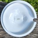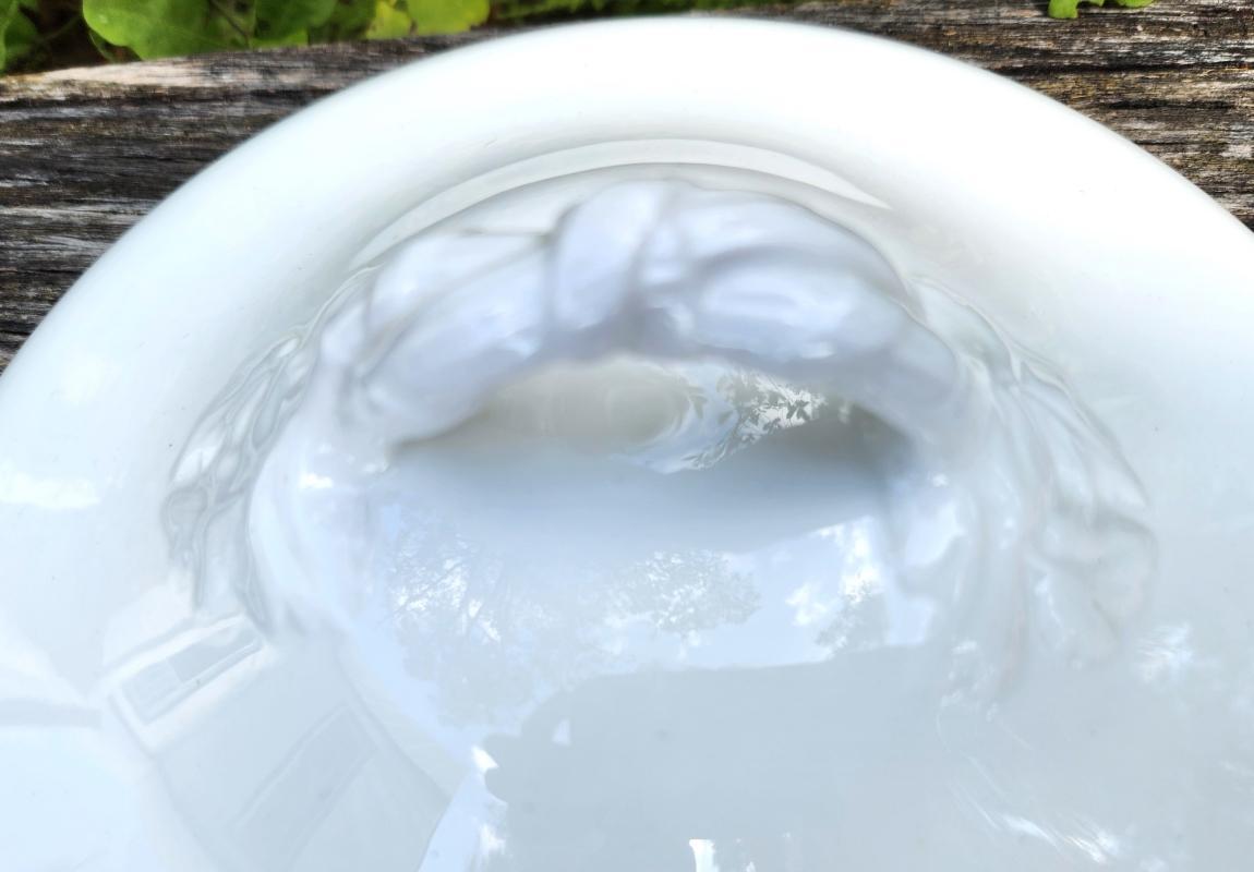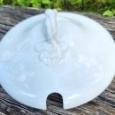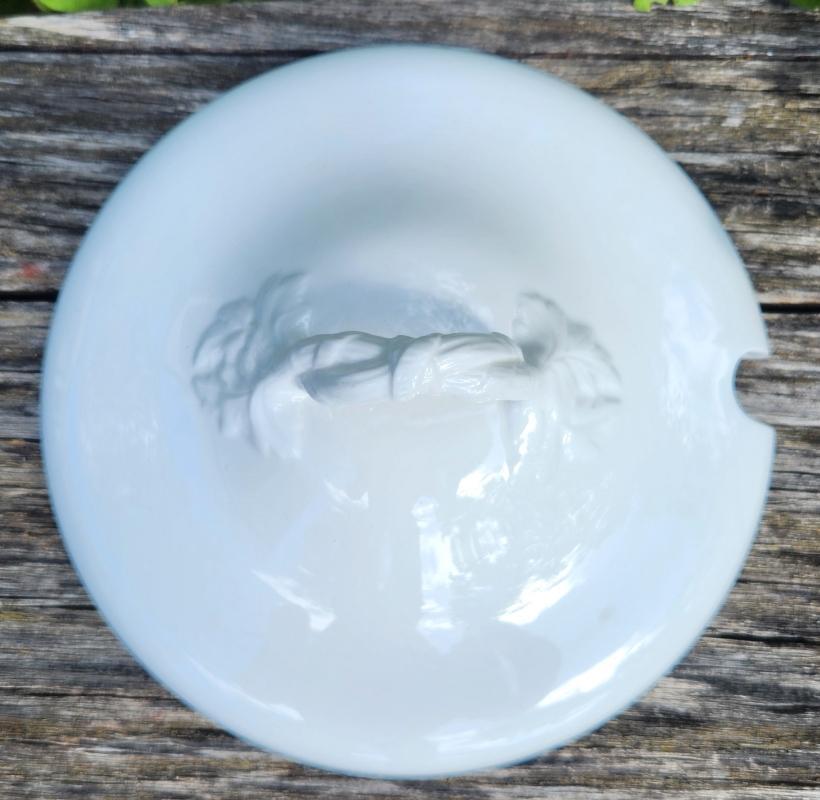 Bone china tureen lid with leaf & vine handle in undecorated white. Marked inside; uncertain of date, though circa 1990s. Measures 7.5" to outer edges, fits a 6.75" opening, and stands 2.5"h overall. Notched for a ladle (not included). Excellent condition with no chips or cracks. Inglenook Antiques...Established 1989.