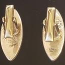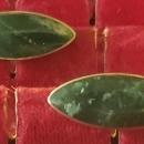 Mexican Sterling silver cufflinks with green stone, possibly jade, in center. Circa 1950s-60s. Elliptical shape. Measure 1 3/16"l x 1/2"w. Marked "Hecho en Mexico/Sterling/925" and eagle assay mark #3. Also marked "JCO", if I am reading it correctly. Nice used condition, with only an antique tarnished patina now, but cleans up nicely if desired. Sold as is. Inglenook Antiques...Established 1989.