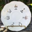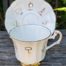 Vintage Taylor & Kent "Cup of Fortune" bone china cup and saucer, made in England. Designed to revive the art and fun of tasseography, or "tea-leaf reading". Made in the 1960s. White with metallic gold symbols and trim. This one is #1. Cup measures 3"h at handle, saucer 5.75"d. Promoted through Red Rose Tea. Nice condition with no chips or cracks. See our other listings for #2 & #3. Inglenook Antiques...Established 1989.