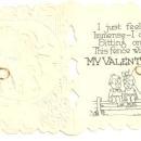 Vintage Valentine Card. Girl and Boy Sitting on Fence on Front. I just feel Immense I do Sitting on This fence with you, My Valentine. Valentine in 3 1/2" high and 3" across. Valentine is in good condition, slight wear at edges, paper clip mark inside