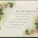 New Year Greetings Postcard. Front has Holly. These holly boughs my Greetings frame In brightest hue: And framed in happy friendship came This card to you. Back is postmarked 1920. Postcard is in good condition, wear at edges
