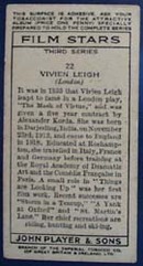 Vivien Leigh Film Stars Movie Card, This is number 22, third series by John Player and sons. It gives a history of the actor and is from 1938. Excellent condition, 1 1/2 x 2 1/2 inches