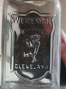 Weideman Boy Brand Bail Handle Canning Jar. Clear canning jar shows a boy with pie, marked Weideman Boy Brand Cleveland on the front, excellent condition, no chips. 3 1/2 x 8"" quart jar