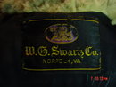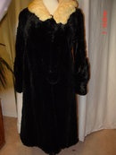 Vintage black fur coat with an off-white and black fur collar made in the 1920's by W.G. Swartz Co., a favorite Norfolk department store for many years. The collar can be rolled down for a solid color effect, or it can be pulled up as a partial hood. The yellow fur is dry rotted. The coat is lined in a patterned black satin material with a pocket inside on the left, and a double strap sewn on the right waist can be cinched through a loop on the front edge to secure it closed. There is a small black button near the collar with a large loop on the right to close the neckline. There is a 2-1/2" fur button on the front left which goes through another large loop on the right at waist level. The sleeves are double banded with a large triangle shape material basted above it, and the lining under this area has deteriorated on both sides. The fur is in very good condition, but this coat needs a good cleaning. There is no size tag, but it probably is around a size 8.