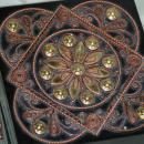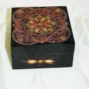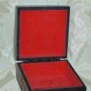 Beautiful Ethnic Hand Crafted Hinged Wood Box with Copper Wire Work and Brass Decorated / Trinket Box . The wood is painted black with the ornate decorations of twisted copper wire and brass accents on the top and a three of the sides. It marked on the bottom with some type of stamp that is illegible. It measures 4 3/8 squared x 2.25" tall. The inside is lined with short nap red velveteen. The condition is excellent.