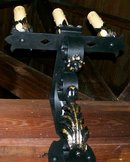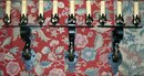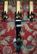 Hand wrought electrified sconces from the early 1900's. Black enamel finish with gold leaf accents. Completely rewired for safety. Each has 3 "candles" with fiber-drip candle covers. Each measures approximately 12"w, 9" projection from wall, 13"h backplate with overall height of approx. 20". Will require special packaging due to weight & size. Have 3, priced separately, but happy to combine shipping. Just contact me before ordering. Inglenook Antiques...Established 1989.
