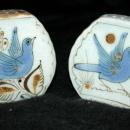 Mexican Folk Art Pottery Salt and Pepper Shakers from Tonala area of Mexico. In excellent condition, no chips, both corks still work. Signed. Each measure approximately 2.5"H x 2.75 " L X 1"W.ent. They both have cork stoppers.