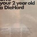Die Hard Battery by Sears 1968 Ad. This 2 page black and white October 29 ad states Give your 2 year old a Diehard.Americas most powerful car battery makes a great present for your car. Picture shows A Sears Die Hard Battery with two Burning Candles on it. Magazine tear sheet picture is taken through plastic and may show wrinkles or crookedness that is not in the ad. This original magazine tear sheet measures 10 inches wide by 13 1/4 inches tall.