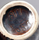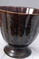 Vintage Retro Art Deco Brush Footed Pottery Bowl. It has Brown Glaze with light Speckles. The inside has some rays of blue. The "foot" is ringed and the body texture of the pot is with vertical lines and the rim is scalloped. It is 5.5" tall and 6" across the top. The bottom is signed Brush USA 817. It is in excellent condition.