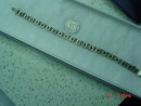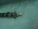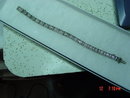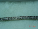 This 14K white gold bracelet weighs 12 gms. and has 21 filigree links. Three links have a white gold diamond shape with a round faceted diamond mounted on top. The tongue of the clasp is stamped 14K and a spoon shape stamp. There are rings on each side for a chain, but it is missing. This is a beautiful piece of arm candy!
