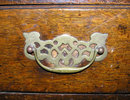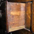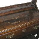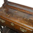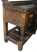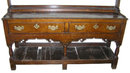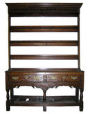 This lovely Welsh sideboard dates from the late 18th to early 19th century and was appraised by Sotheby's in 1998 for $17,000. (We will be glad to provide a copy of the appraisal at time of sale.) It measures 6 feet wide, 9.5 feet high and 16.5 inches deep. It features a shelved superstructure above rectangular surface fitted with 2 drawers on turned supports. The top is flat with a molded cornice, and the valance features a unique pierced interloop carved motif. Four grooved plate shelves. Lower section has a molded edge top over two half-width frieze drawers with old brasses. This section has a valanced apron on three baluster posts over a base shelf supported by block feet. The looping design of the frieze and the pierced apron are characteristic of dressers from the county of Shropshire in the West Midlands, just east of Wales. A couple boards on the lower shelf must be renailed. The left-side cornice molding must also be renailed in place. Patina is rich and warm, and extremely old. Provenance provided upon request. Additional images gladly forwarded upon request. ( buffet english british )