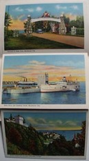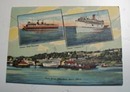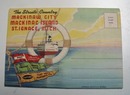 1938 Mackinaw City drop down cards, linen outside cover 4 1/4 x 6 1/4"" with views of the Ferry, state park, main street, light house, city hall, Greyhound Post House (nice sign), old fort, block house, auto ferry, castle rock, Marquette monument, cut vier bridge, arch rock, Grand hotel and south shore drive. Mint condition, outside cover shows two steamers the Chief Wawatam and Algoma II and the dock scene.