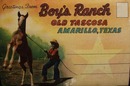 1940's drop down pc's of Boys Ranch in Old Tascosa Amarillo Texas. Wonderful pictures showing life and the story of the Boys Ranch that was made famous by Metro Goldwyn Mayer and more. Shows ranching activities and even the basketball team. Excellent condition a little wear, but still nice, 4 1/4 x 6 1/4"" linen outside