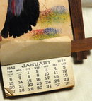 1952 Calander with all the months there. It is tear off type at the bottom of a framed peacock picture made of real bird feathers. The frame is 6 7/8" x 5". The condition is great for such an old paper item. On the bottom slat of the wood frame it says Burke Monument MFG co. It must have been a customer give away.