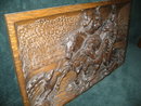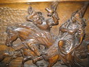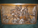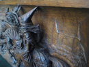 This work along with item # 2505, can be purchased separately or as a pair executed by the same artist. These pieces descended in a family from the original carver who came to New York from Germany in the 1870s. These German immigrant carvers were famous for the carved tobacco Indians and the carousel horses that are extremely popular and collectible. When not commissioned as mentioned above, they produced decorative works such as this item and item # 2505. The quality of the carving and the detail of the work is of the highest caliber. Only master carvers could produce items such as these. The most important characteristic of this work is that it is entirely carved out of a single piece of wood. There are no applied pieces. Everything is carved out of the oak block. Dimensions: 29 5/8" x 17.5" and 5" in depth.