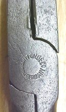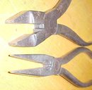 This is a nice, clean group of 2 pair of pliers, both are marked "GERMANY". The narrower flat jaw pliers are marked with very small lettering "HUSSON FORGE CO. GERMANY" and are 6" long with 3/16" wide jaws at the very end. The are in good working condition, some wear on the wire cutting feature, good pivot joint, some very minor pitting noted. The other pliers are marked "LUMA GERMANY" on the inside parts of the handles. The are in good working condition with some play in the pivot joint, some wear on the jaws and cutter, and one side piece of the end of the handle cracked off. Overall in good shape, but mostly just a rarely seen early 1900's group of 2 pliers!
