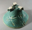 3 footed dragon fly art pottery bowl. Nice artistic bowl with a earthy green and gunmetal green spot matte glaze. Artist signed T Feign, appears to be student work, there are dragon flys carved into the sides. Very decorative. 6 x 4 inches