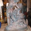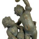 This delightful gesso carved group of putti, possibly inspired by "La Source" by Albert-Ernest Carrier-Belleuse (French, 1824-1887) or the works by Claude-Michel Clodion (1738-1814) dates from circa 1900 and measures an impressive 34" tall, 24" wide and 16" deep. Depicted is a cherub spilling water from an urn with another cherub drinking from a shell. Its design and exceptional construction suggest it comes from the studio of a master, such as Henri Dasson of Paris. There are no hallmarks. It features a faux marble giltwood pedestal. Condition is good. There are cracks and losses noticeable at the base of the gesso in the rear. Restoration services are available prior to shipment.