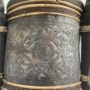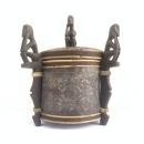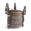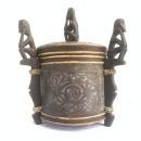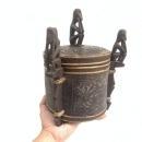 A gorgeous 280mm tall Lupong container from the Iban people of Sarawak, the body made of natural tree bark/skin(decorated with typical Aso and Buah Berinjan: Dayak tattoo) whereas the Guardian Poles and stopper/cover are carved from wood. More beautiful in real life, a must have! New collection, good condition.