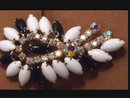This is one of the longest and largest Juliana brooches that I have seen. It measures a whopping 3 1/4" long and 2" wide. All the stones are glass which gives this quality piece weight and beautiful design. The stones are white and black with gorgeous aurora borealis rhinestones. All are PRONG set.