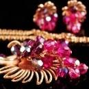 Cascading waterfalls of fuchsia cut crystals with pink aurora borealis tumble from this long golden color frame pendant. The matching clip on earrings have the same design. The patent number 156452 is on both the earrings. Companies like Schiaparelli and Sherman used these patent numbers on their jewelry. The double chain necklace has raven aurora borealis drops that accent this rich fuschia color. The necklace is 20" on the shortest chain and the pendant is 3" long. The set is prettier than the photos and really glistens when you walk with all the color that comes off these beautiful glass crystals