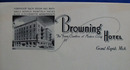6 pages of stationery from the Browning Hotel of Grand Rapids Michigan from the late 1800s or early 1900s, There are 4 good sheets and two that have a small moth hole, the pictures and Trademark on the top are mint condition on all of them. The paper is a little discolored from age, but I still think these are excellent. 6 x 9 1/2 inches.