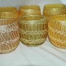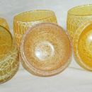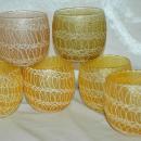 6 very retro glasses in pastel colors They are known has Roly Poly Spaghetti glasses . 4 are yellow, there is one pink and the other is a pale olive green