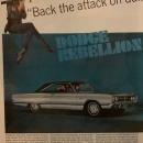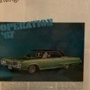 67 Dodge Coronet 1966 Ad. This 2 page October 8, 1966 ad states back the attack on dull driving. Dodge Rebellion Operation 67. Picture shows man and woman in Silver with Black top 2 door hardtop Dodge Coronet. Also shows Green with black top 4 door Dodge Monaco 500. Magazine tear sheet picture is taken through plastic and may show wrinkles or crookedness that is not in the ad. This original magazine tear sheet measures 10 inches wide by 13 1/2 inches tall.