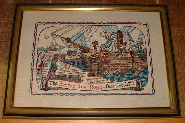 Vintage Academy Arts "Historical Sampler" of the Boston Tea Party in a maple and black finished wooden frame. This hand-embroidered sampler depicts American colonists and Indians throwing boxes of tea from a ship into the harbor. A banner across the bottom reads The Boston Tea Party ~ December, 1793. It is signed by the maker, B.E. The piece is beautifully framed in a maple finished wooden frame with painted gold and black velvet trim. The frame measures approximately 22.75 inches wide, 16.75 inches wide and 1 inch thick. The sampler area measures approximately 19.5 inches by 13.75 inches. This piece is in very good condition, with light wear and a bit of missing finish to the frame and a few small areas of discoloration on the sampler. Please refer to the 4 photographs for appearance and condition. Shipping / handling will be determined based upon zipcode of buyer.