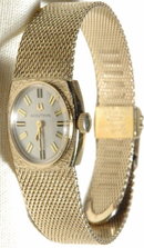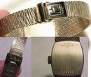 The gold metal mesh band buckle has an interesting push button locking mechanism. The band is 7 11/16. This watch has been previously owned but it is in what I consider to be excellent condition. The only wear evident is a few minor microscopric scratches on the case back and a few areas on the flat surfaces on the band.