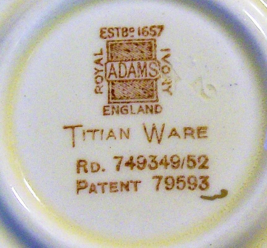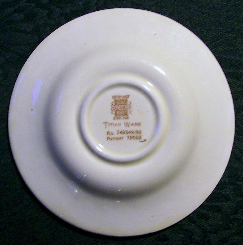 Titian Ware saucer in the "Rose of Italy" pattern, made by Adams. Registered in 1929, made circa 1935. Royal Ivory rim embossed with cherubs, rose and mixed floral decals inside verge area. Gold metallic trim. Measures 5 5/8"d. No chips or cracks. Saucer only. Inglenook Antiques...Established 1989.