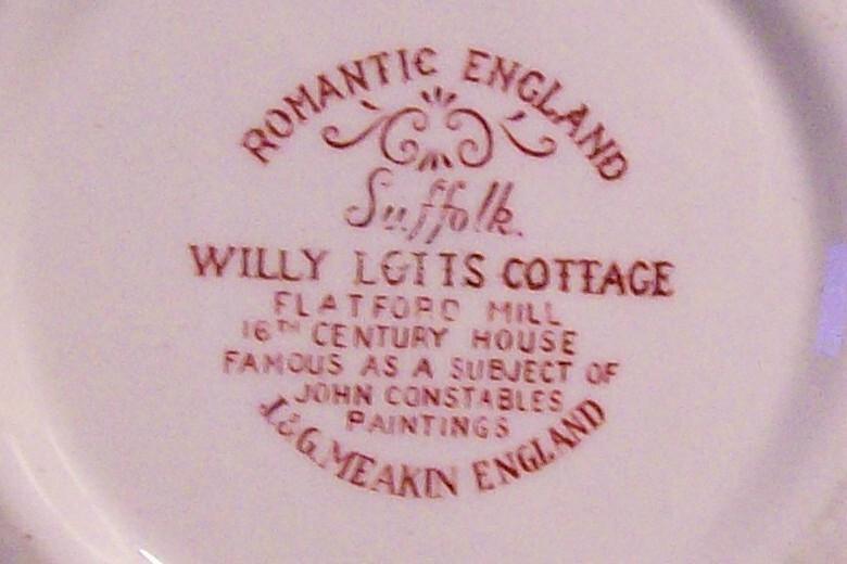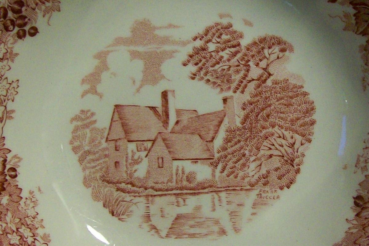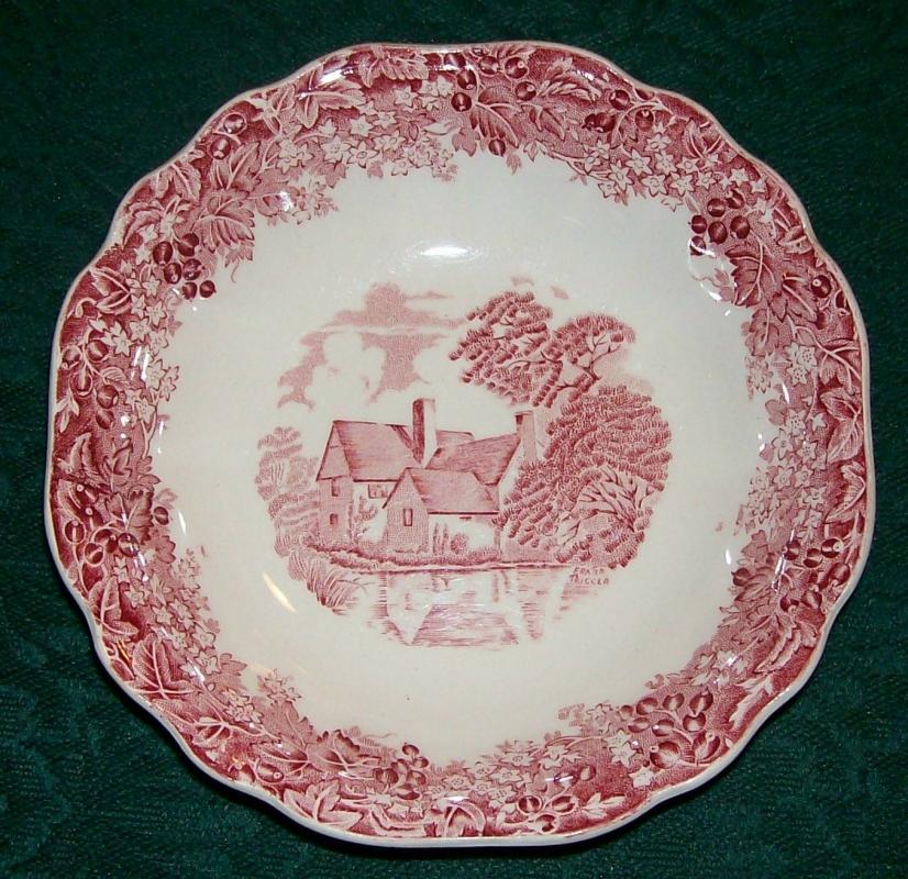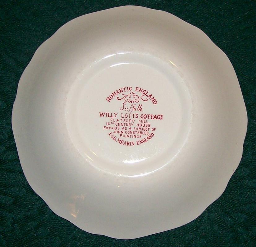J. & G. Meakin "Romantic England" bowl in red transfer print. Made in England before 1961. Measures 5.5"d. Very good condition with little surface wear, no cracks or chips. Some pieces may have crazing of the glaze. Have 5, priced separately, but happy to combine shipping. Just contact me before ordering. Inglenook Antiques...Established 1989.