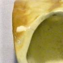 American Bisque Company figural planter from the bear series of the 1940's. This one has a whimsical black "Bear on Log". Measures 6"l x 5.75"h. Has a 1/2" hairline crack at the edge of the planter opening, next to a glazed-over factory flaw, as well as general crazing of the glaze. Sold as is. Inglenook Antiques...Established 1989.